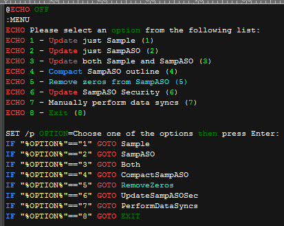 You will notice that the top starts with “:Menu”. This tells DOS to present a menu option to the user. The second part to this section is reading what the user wrote for an option then telling the system where to go for the commands.