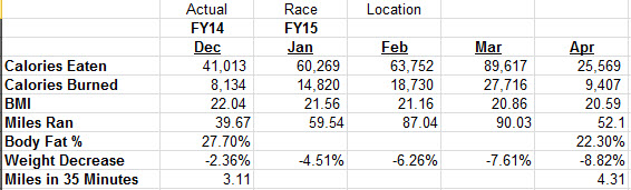The reality is, the marathon isn’t the main thing I am shooting for this year; it’s just 1 of 3 big races in which I’m competing. The next 2 are the Raleigh Half Ironman on May 31 and the Beach to Battleship Full Ironman on October 16th. The marathon was almost a training run for these other events – and I reminded myself of this many times last week! When I found myself getting nervous in the days before the race, I told myself that this weekend was the lightest (in total miles) that I will have for about the next 15-16 months (as I plan to also do the Lake Placid Ironman in 2016). 🙂 I will continue adding to my database through, at least, Kscope, as I will be presenting on it in June.