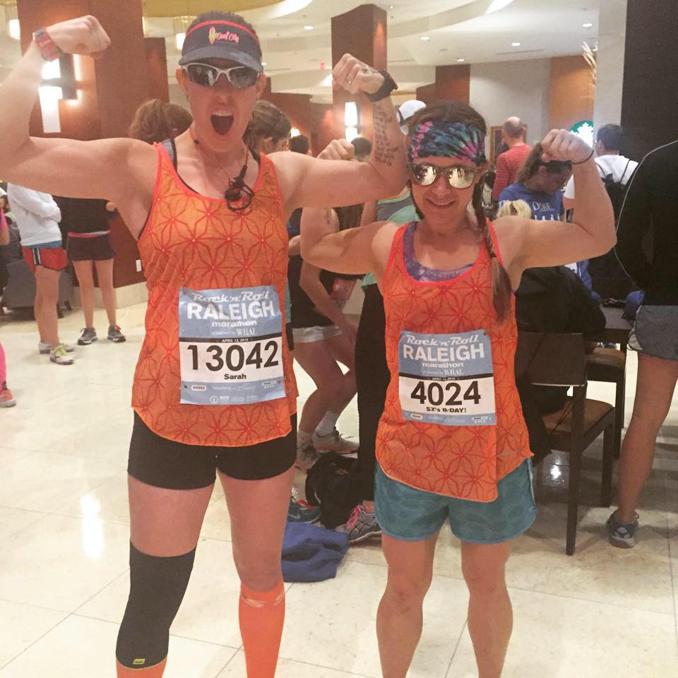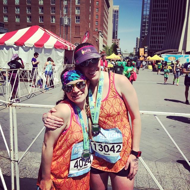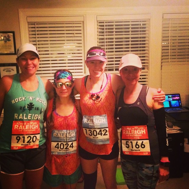 Many of you have been asking about the race – so here is the race recap! First off, the weather was perfect. Around 50* at the start of the race and 65* at the end. The sun was out and there was a breeze that felt amazing on some of the stretches. I had my girls in town to run the race from Seattle, Atlanta and Columbia (SC) and we were all ready to go. I’m normally a nervous wreck before a race. I will get in line at the port-a-potty, go, then immediately get back in the same line to continue the cycle multiple times over. My gut does not like nerves. However, because of proper training and nutrition and increased self-confidence, I had none of my previous life’s issues. I was just ready to get started! One of my worst training habits on the long runs was going out waaay to fast for the first 3 or so miles, so I made sure to be mindful to not do this in the race and mess up my last few, ornery miles. And I did perfectly on this! I was honestly feeling great and had the best support crew out there – my husband – who met me at predetermined miles to give me water, gel, almond butter or bars to keep me going. He has always rocked on support as he inline skates the race ahead of me to keep me as fresh as I can be. Raleigh is rather hilly, but our training took us on hills that were greater than the hills we experienced in the first half of the marathon. I had wonderful surprises of Chris and Juliet (another runner/biker friend who runs 100 mile races…) cheering me on at miles 7, 11 and 25.9 (I think those are correct…). What an uplift in spirits seeing familiar faces cheering you on! More on 25.9 later…