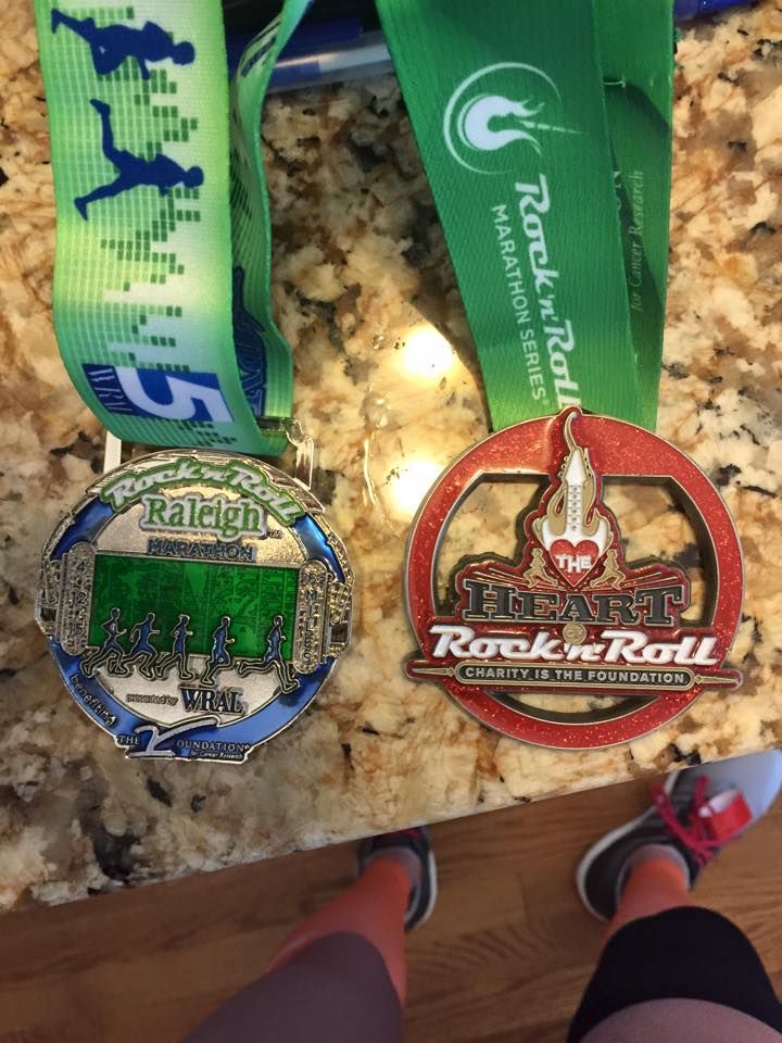 Once we got to the half marathon and marathon course split, my friend Tara and I headed towards the “schools” portion of the course, as I put it. We ran through Meredith College then NC State University. The water stations were, bluntly, spaced too far apart, especially for the heat and sun…and distance in this race. It was during my run in Meredith that I realized I would need more water than planned for the race because I got completely confused on the loop run. I couldn’t figure out why the mile markers were going backwards. It wasn’t until we exited the school grounds that I realized the mile markers I saw going backwards were ones that I had already passed. (you can say, “DUH”, if you want…but mentally it was getting tougher to stay on track). My original goal for the race back in December was 4 hours 30 minutes. At the halfway point, I was at 2:17 on my watch. Perfect! And I was feeling relatively good, so I kept the pace. Around mile 16 one of my favorite songs came on my playlist. It is my husband’s ringtone, we saw the singer in concert a couple weeks ago and the singer (not song) was my husband’s and my first dance at our wedding. The song was “Heartbeat” and I just can’t NOT dance whenever I hear it. So, dance I did from mile 16 to 17! My friend was cracking up and my run-dancing, jump and arm pumping. The best part? The police officer on that stretch started dancing with me, too! Soooo much fun! Then came about 2 miles of hills that tore me up physically and mentally. I wasn’t able to keep up my 4:30 pace and the hills just.would.not.stop. My original plan was to get to mile 20, then belt out the last 10k of the race. Well, the 17-19 miles nearly defeated me. I wasn’t going to quit the race, but I was almost punching the air in frustration. I knew 4:30 was not going to happen. So I created a new goal on the spot – beat 5 hours. My previous best marathon was 5:39 in 2011. If I could get in the 4 hour range, I’d still consider that a big win…especially given this course.