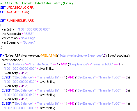 That can’t be right. Do you get more specific later on about which months to copy, based on the value of TransferMonth? Are you equally specific about which months you clear? From what I can see, I’d lay it at the doorstep of not FIXing on Period. (Whatever it is, Essbase understands how to do an IF with multiple lines, for sure.)