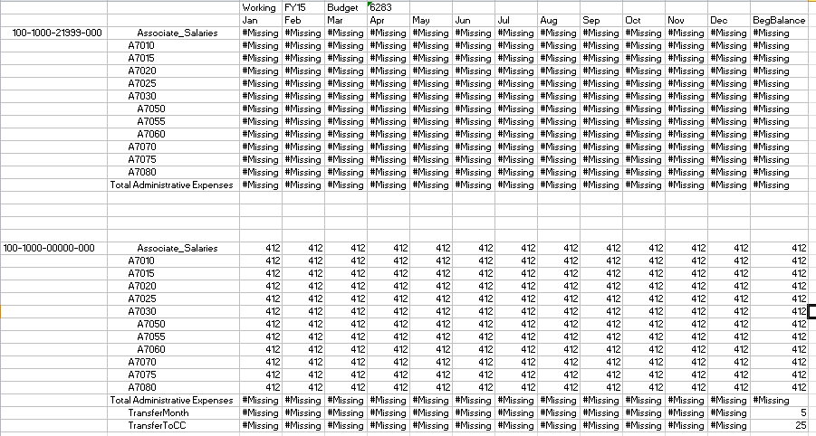 Here is my test worksheet. The bottom part of the sheet has the original data. The top is the new cost center that data is supposed to copy to.