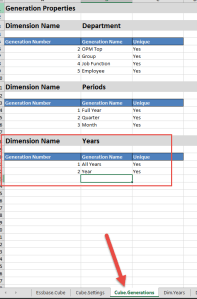 The second way to do this in EssCS is to use the Cube Designer workbook. On the “Cube.Generations” tab, enter the names of the generations for the dimensions you want updated.