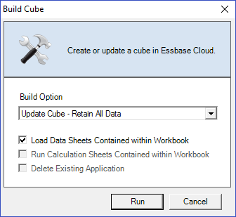 Choose to “Update Cube – Retain All Data” and click “Run”. You will likely not want to load the data sheets, but you can if you would like to.