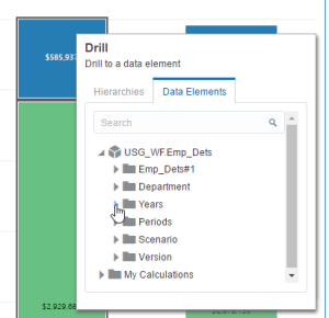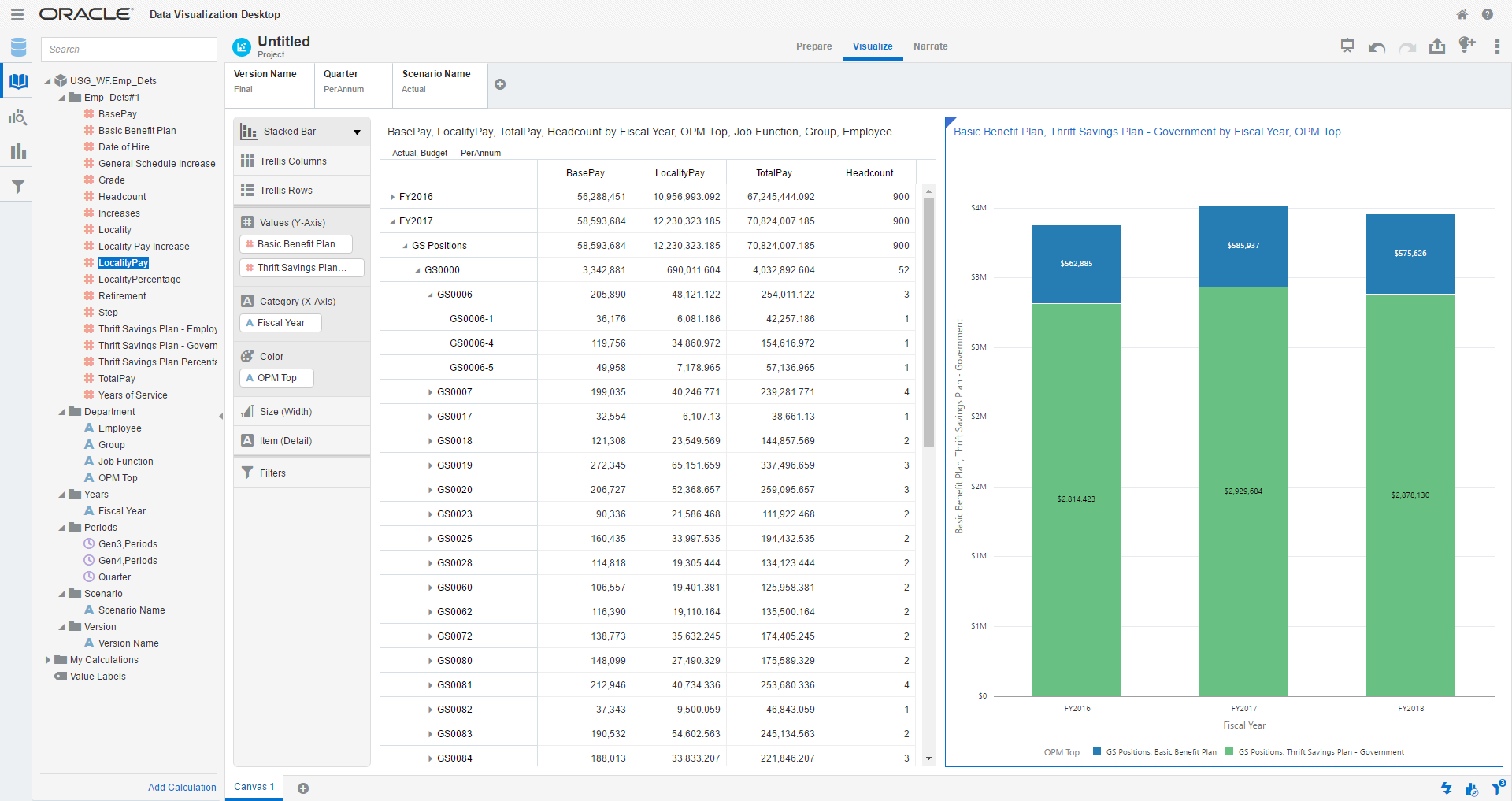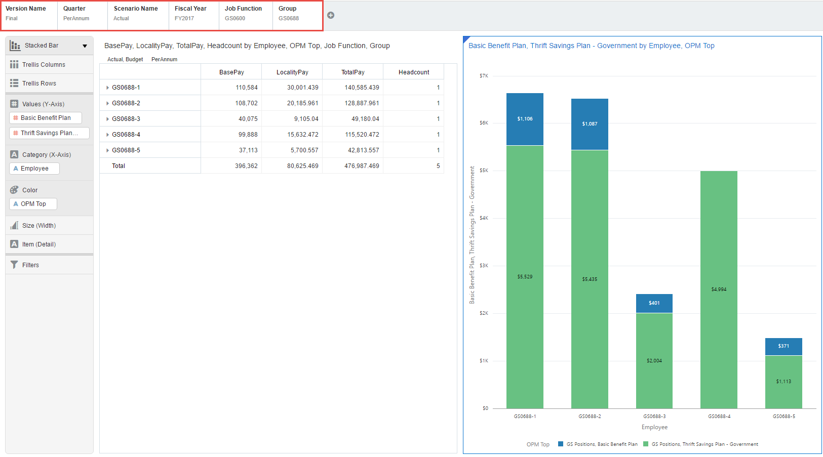 Unlike in Smart View or HFR, you are NOT required to specify a member from every dimension in DV. Using the below as an example, I built a Row Expander visualization that is very something that we would normally build in Smart View for comparison. To the right, I used a stacked bar graph using just a few data elements. I’ve modified the visualization to show the currency amounts for the whole of what the government paid towards employee’s Basic Benefit and Thrift Savings Plans (no, it’s not real data!).