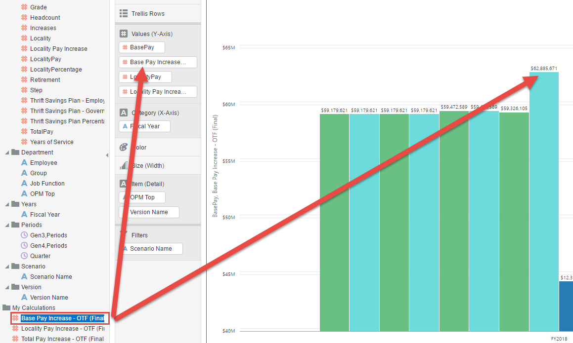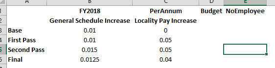 To create a new what-if Version in this case, I created a new Base Pay Increase, Locality Pay Increase, and a total of the two. Here are the calculations: