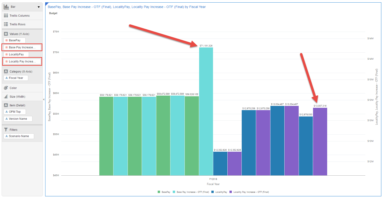 When I add these two items to the graph (and adjust the visualization properties to add the new Locality Pay Increase calculation to the 2nd Y-axis), I get the following visualization: