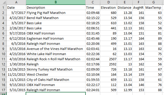 Below is the data set I am working with for my example. I wanted to see if there was any correlation between my race times and course elevation, average HR, and max temperature (F) of the day.