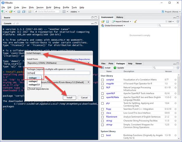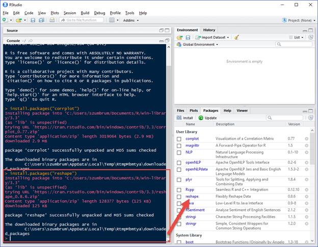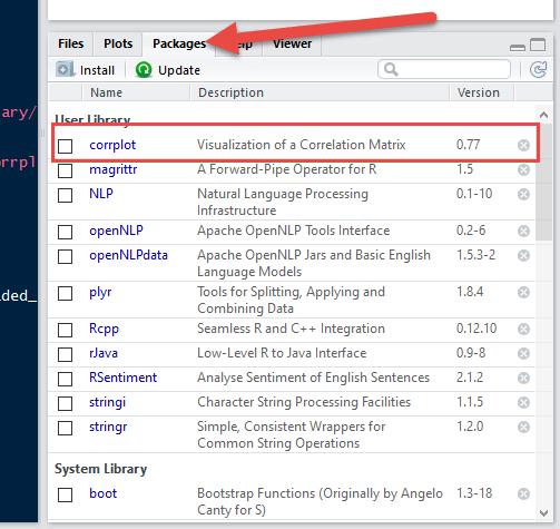 In R studio (or the standard R console, if you prefer), you can type “install.packages(“corrplot”)” then hit enter to install the corrplot package, as told to us in the Store instructions.