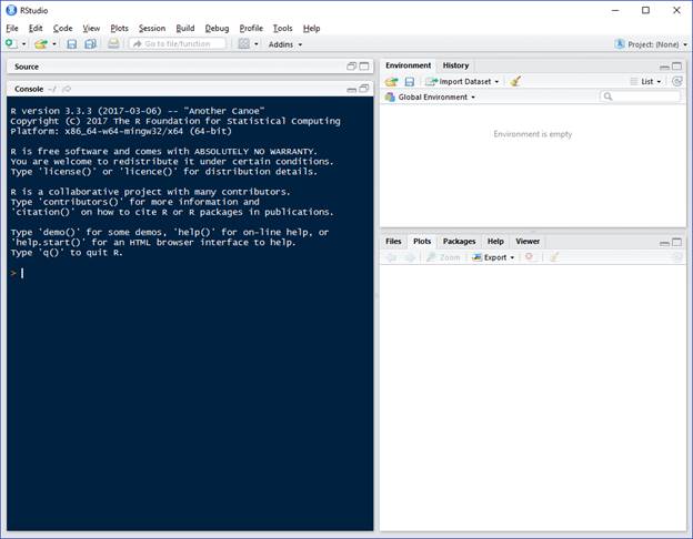 The first thing I need to do is install the R packages to my R installation. There are two main interfaces I use to build R scripts. The first one is the standard installation console, shown below.