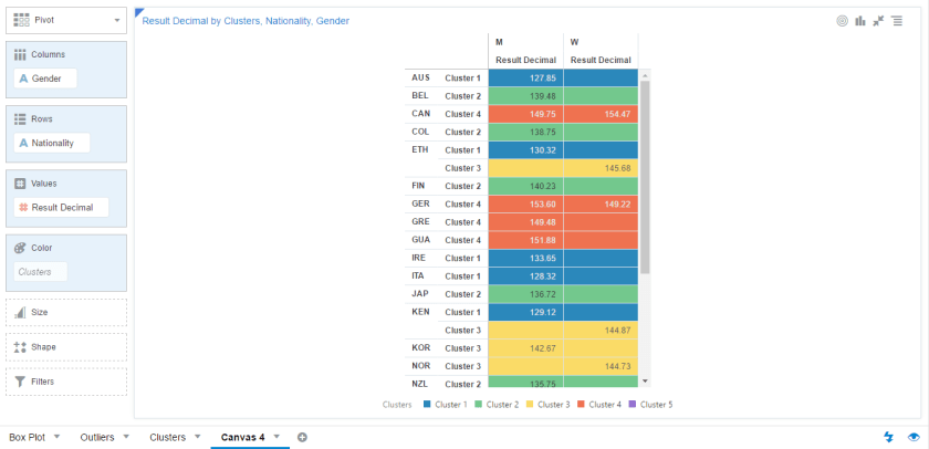 To finish off the options, you can choose how to cluster the data based on the cell value, rows, columns, or both. The default is Cell and the data points are evaluated individually. With Rows, the values are evaluated on a row basis (ie: Nationality). With Columns, the values are evaluated by the chosen Column(s) (ie: Gender). If you choose Rows & Columns, then it is a function of those items. Because our data set is not ideal for showing these options, it might help to see a visual of what I just described:
