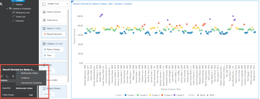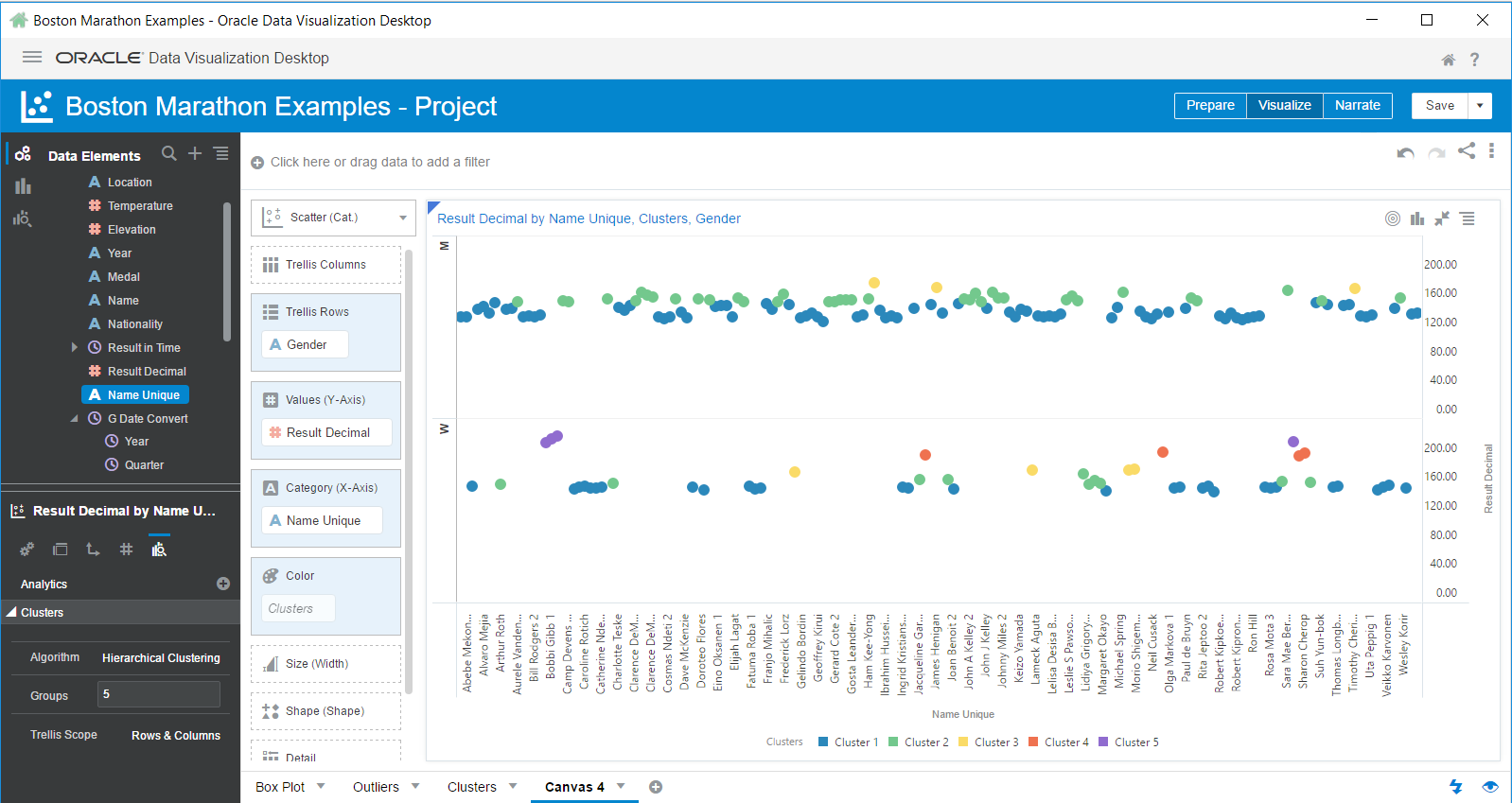 The first thing I want to show are the options for Clusters in DV. In my Scatter (Category) diagram I have a simple visualization of each finish time by name. I’m going to add Clusters to Color.