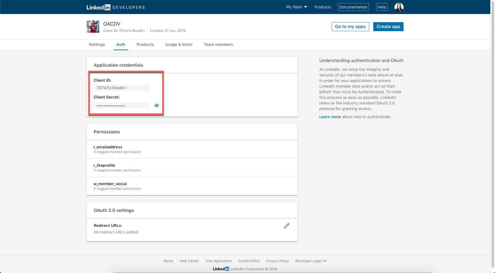 From your LinkedIn app “Auth” page, copy your Client ID and Client Secret.