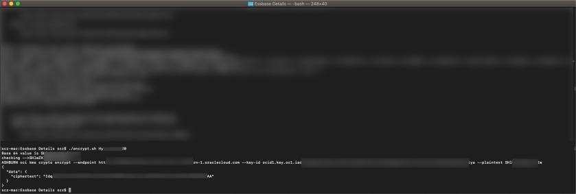 image047 image048 image049 image050 Encrypt your EssbaseAdmin password via the Vault Key. You can either write the oci by hand or use a script. If doing “by hand”, first convert the password to base 64.