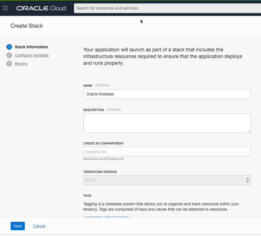 Choose your Availability Domain, Instance Shape (OCPUs), Storage Size, the SSH Public Key you generated earlier, the Essbase Admin username, and, finally, the Encrypted EssbaseAdmin (from the oci command line) password.