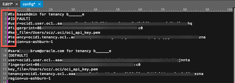 - Create multiple entries in your OCI config file. To comment out a line, enter a pound sign (#) in front of the line to rem it out. You will notice that both lines contain the same fingerprint. The fingerprint is loaded from your local certificate (.pem) file on your machine, hence why they are the same. For example, below I’m commenting out my EssbaseAdmin credentials in favor of my email credentials. The only thing that needs to be changed is the user OCID if using the same computer and tenancy.
