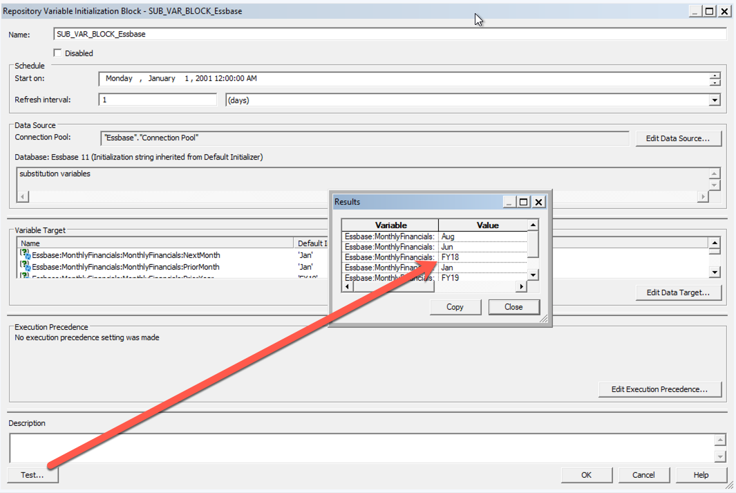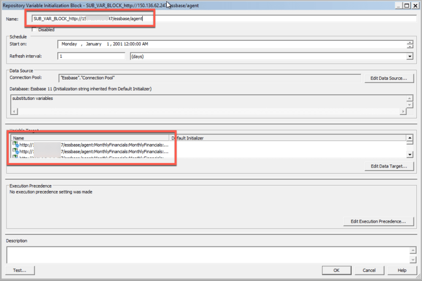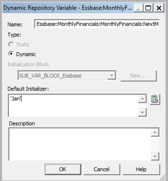 - You can rename this if you would like. Also, the “Variable Targets” are listed automatically for you. These targets are the Sub Vars in Essbase. The Default Initializer is the default value for the variable and are initially blank.