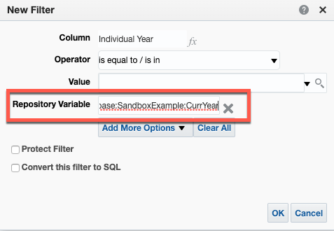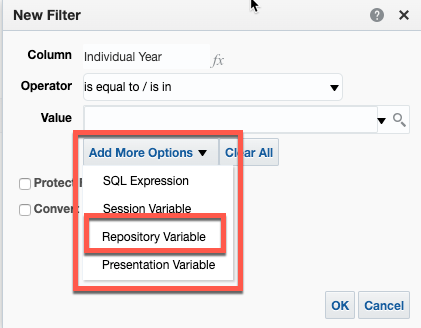 Choose the dimension for the variable (Year in my example) and select “Add More Options” and select “Repository Variable”.