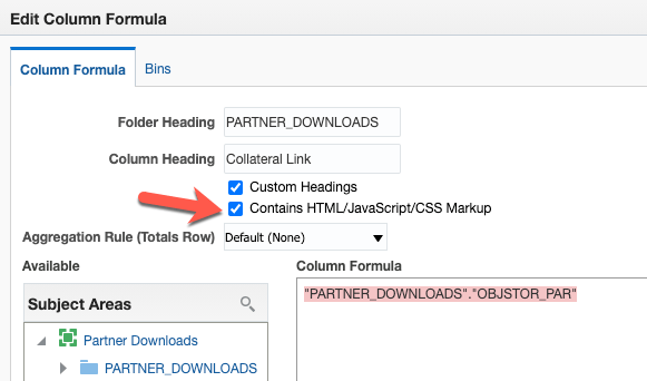 After setting it to HTML you need to tell OAC that the column contains HTML. In the Edit Formula option, check the box for “Contains HTML/JavaScript/CSS Markup”.